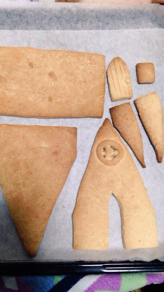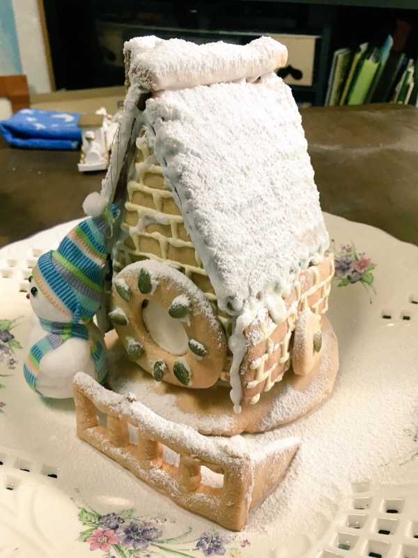 レシピ通りに綺麗に作りたいのですが、アイシングの接着作業で壁が傾いて大きな隙間ができてしまったので雪だるま君で隠しています 笑