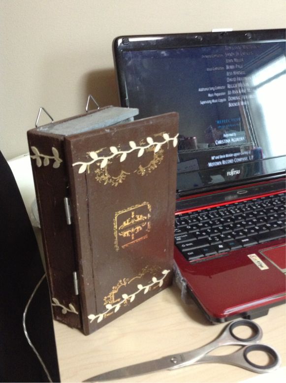 実際に組み立てると、木の板が硬すぎて、きり通しと蝶番の取り付けがしんどかった; 失敗して、ネジを外したりつけたりしたもので、写真に写ってない部分は結構ボッロボロです^_^;