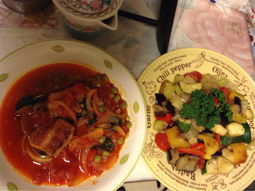 出来たのがイギリスの伝統料理のカポナータ!↓左はイタリア料理のラグーです。ラグーはもっと大きいお肉を深鍋で1時間ほど焼かないといけないんですが、安物のお鍋しかなかったので1/4くらいのお肉をざっくり焼きました;